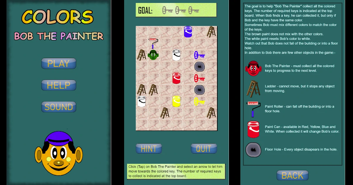 Collect all the colored keys.You have to match the color of the key in order to collect it.Mixing primary colors makes the matching color of the key. *mouse* = move